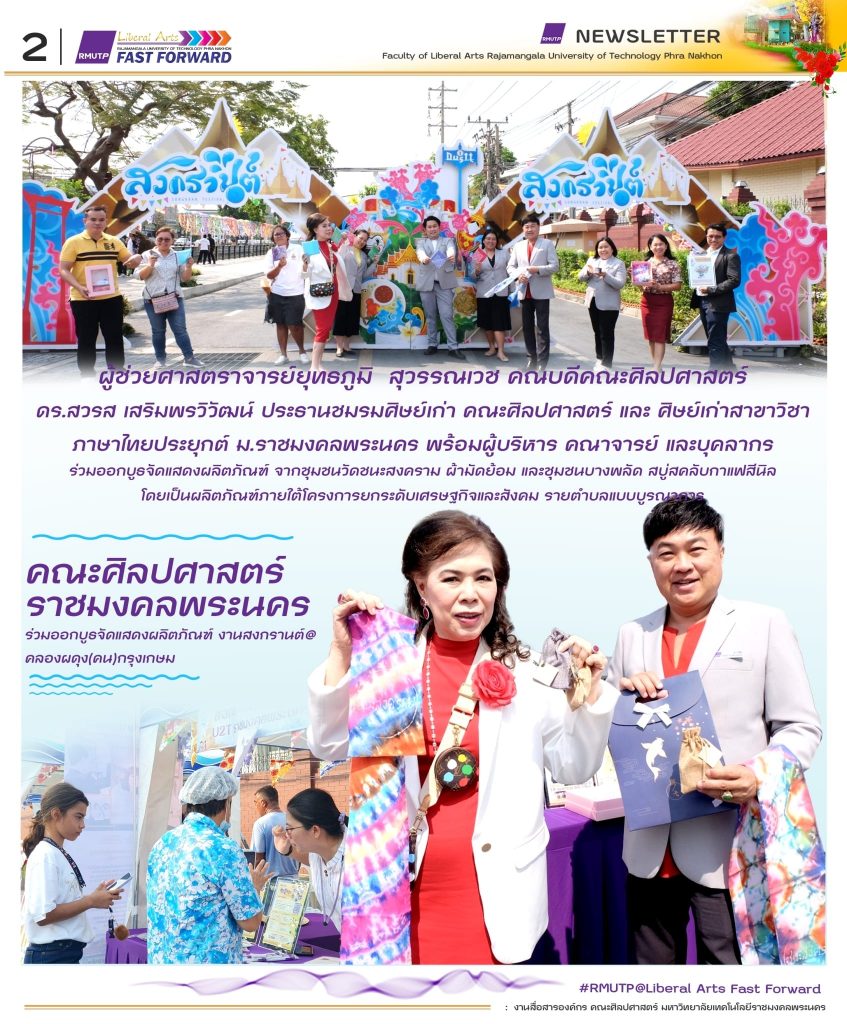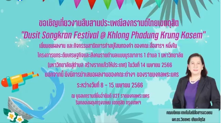 คณบดีคณะสื่อสารฯ ราชมงคลพระนคร ขอเชิญชวนเยี่ยมชมผลงาน และกิจกรรมสาธิตการทำสบู่โสมทองคำ ของคณะสื่อสารฯ หนึ่งในโครงการยกระดับเศรษฐกิจและสังคมรายตำบลแบบบูรณาการ 1 ตำบล 1 มหาวิทยาลัย (มหาวิทยาลัยสู่ตำบล สร้างรากแก้วให้ประเทศ) ในวันที่ 14 เมษายน 2566 ในงานสืบสานประเพณีสงกรานต์ไทยเขตดุสิต “Dusit Songkran Festival @ Khlong Phadung Krung Kasem”