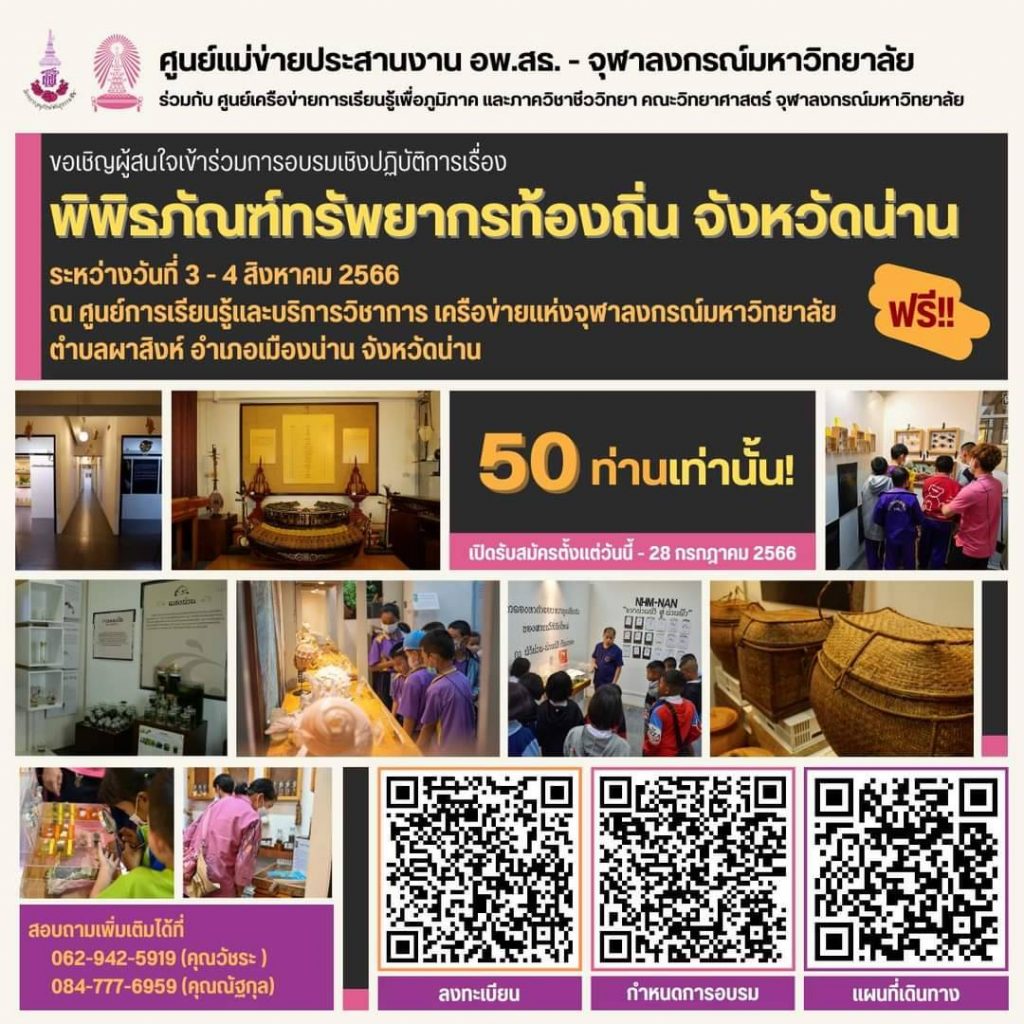 ❗️❗️ อบรมฟรี ไม่เสียค่าใช้จ่าย ❗️❗️ ศูนย์แม่ข่ายประสานงาน อพ.สธ. – จุฬาลงกรณ์มหาวิทยาลัย ร่วมกับ ศูนย์เครือข่ายการเรียนรู้เพื่อภูมิภาค และภาควิชาชีววิทยา คณะวิทยาศาสตร์ จุฬาลงกรณ์มหาวิทยาลัย ขอเชิญผู้สนใจ เข้าร่วมการอบรมเชิงปฏิบัติการเรื่อง ⭐️ พิพิธภัณฑ์ทรัพยากรท้องถิ่น จังหวัดน่าน ⭐️ 🗓️