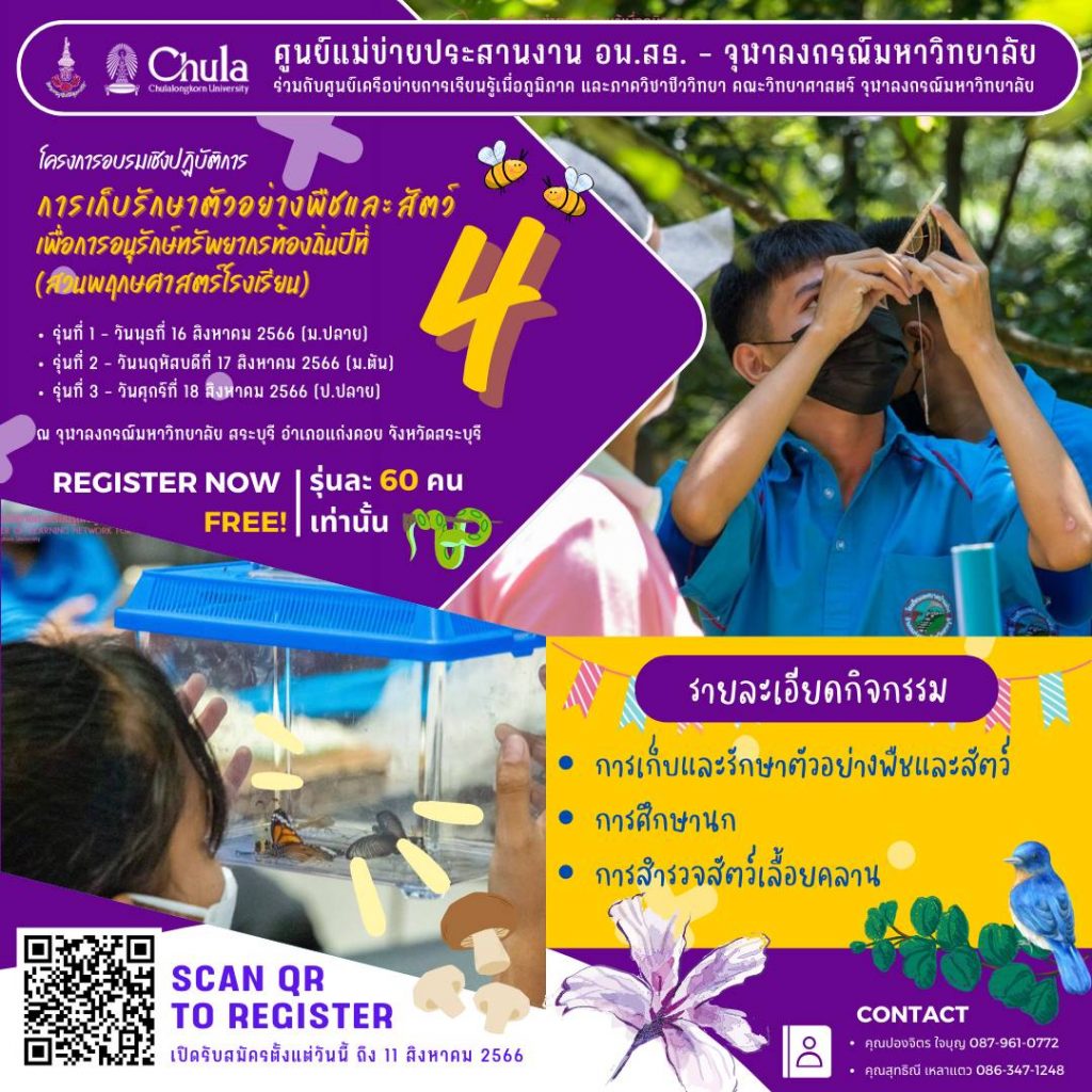 ประชาสัมพันธ์ ศูนย์แม่ข่ายประสานงาน อพ.สธ. – จุฬาลงกรณ์มหาวิทยาลัย ร่วมกับ ศูนย์เครือข่ายการเรียนรู้เพื่อภูมิภาค และภาควิชาชีววิทยา คณะวิทยาศาสตร์ จุฬาลงกรณ์มหาวิทยาลัย ขอเชิญนักเรียนเข้าร่วม “การอบรมเชิงปฏิบัติการการเก็บรักษาตัวอย่างพืชและสัตว์เพื่อการอนุรักษ์ทรัพยากรท้องถิ่นปีที่ 4 (สวนพฤกษศาสตร์โรงเรียน)